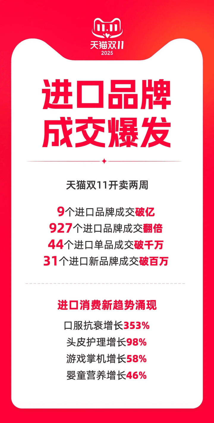此前,各大电商平台陆续发布双11阶段性战报。如天猫双11开卖两周,9个进口品牌成交破亿,927个进口品牌成交同比翻倍。44个进口单品成交破千万,31家首次参加天猫双11的海外新品牌成交迅速突破百万,其中,澳大利亚奶粉品牌Maxigenes美可卓海外旗舰店成交突破800万,成为海外新商成交冠军。